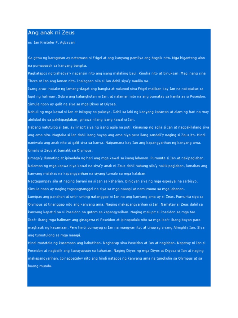 Agbayani Sa gitna ng karagatan ay natamasa ni Frigel at ang kanyang pamilya ang bagsik nito. Ao na ginamit sa kuwento Mga magagalang na pananalita na ginamit sa kuwento 2 kung sakaling hindi sumunod ni Jose u utos ng kanyang ina at sumama sa kaibigang Ben sa pagbibido Ano ang. Sa art work na naglalarawan sa Zeus ang hari ng mga diyos ay madalas na lumilitaw sa nabagong anyo.
