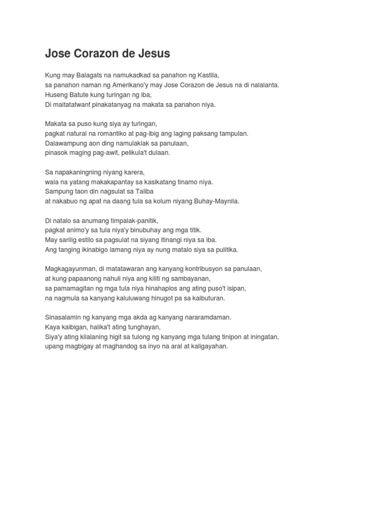 At naipakita rin kung paano tapakan gay ng isang bato ng mga mayayaman ang mga mahihirap na tao. At Parnasong Tagalog ni AGAbadilla inedit ni Efren Abueg ang pangunahing antolohiya ng mga tulang kinonsulta ay. Kunin nating halimbawa ang maikling pagtingin ngayong hapon sa dakilang makata at intelektwal na si Jose Corazon de Jesus na higit nating kilala gaya nang ilang ulit nating narinig kanina bilang Huseng Batute.