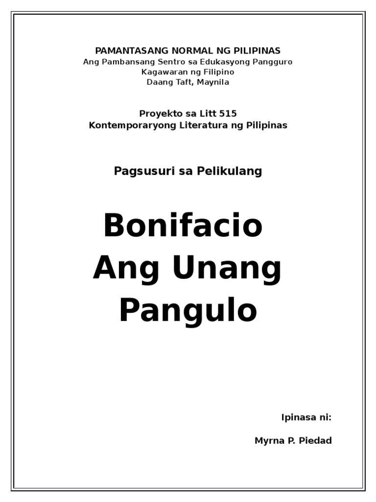 Mga Tula at Akda ni Gat Andres Bonifacio. Kasunod nito ang pag-lilirip sa mga tanong na tila hango sa nasuring akda ni Bonifacio mga tanong pangkasaysayan na magtataya at kikilatis sa pagkakaiba ng mga yugto ng panahon habang sinisikap pag-ugnayin at bigyang-kabuluhan iyon sa pamamagitan ng bagong suhetopaksa ang negasyon ng nakalipas at ng umiiral. Nasakagitingan nina Rizal at Plaridel ang pagka-pilipinonasa tabak Bonifacio ang pagka-pilipino na siyang lumagot sa tanikala ng pagkaaliping nakatali sa inang bayanIyay nasa panulat ni Balagtas na siyang dumakila at nagtaas sa ating matamis at mayamang wikaIyan ang buhay ng bantayog nag pagka-pilipino na naiwan sa atin ng mga dakilang pilipino na nabuhay sa pagka-makabayan at namatay sa.